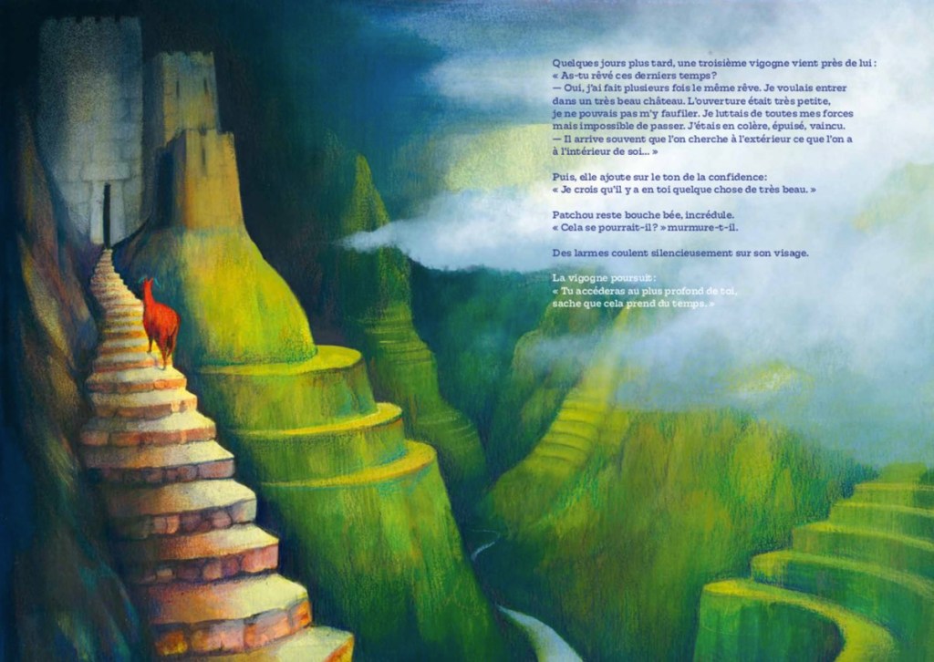 La profusion lumineuse des paysages andins inspire à Odile Santi, jeune illustratrice lilloise, des illustrations flamboyantes et oniriques, d’une grande intensité expressive. On se repait de l’immensité des espaces, du paysage paré de couleurs fauvistes, de la chaleur des lueurs crépusculaires, d’une intrigante construction nivelée évoquant le Machu Picchu et de la beauté des animaux.