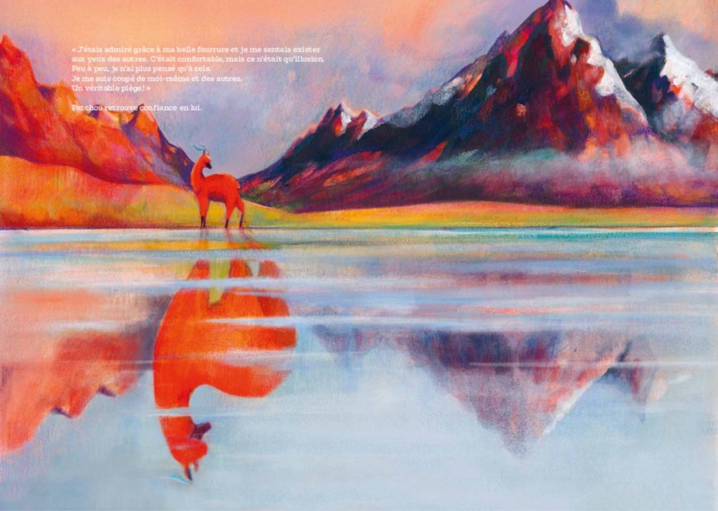 Évidemment, le cheminement sur les lignes de crêtes, avec ses obstacles à franchir, ses haltes et ses hésitations, sont autant de métaphores qui invitent à tirer parti des épreuves pour méditer, prendre confiance, s’accepter tel que l’on est et s’ouvrir à la vie et aux partages. Des leçons de vie inspirantes face à l’individualisme et la dictature du paraître. Cela dit, les dialogues de l’alpaga avec les vigognes qui l’aident à avancer en mettant des mots sur son ressenti m’ont semblé souvent redondants avec l’histoire : « Ton épuisement a été bénéfique. Il t’a permis de regarder en toi et de découvrir le bel être que tu es. Ce cheminement intérieur, personne d’autre ne pouvait le faire à ta place. Tu as connu beaucoup de souffrances et tu en as tiré de précieux enseignements. »