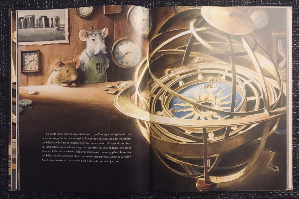L’idée est prodigieuse : les ingénieuses petites bestioles de Kuhlmann ont une soif de comprendre le monde toute communicative. Le problème peut sembler insoluble : comment remonter le temps pour parvenir à temps à LA fête du fromage ? Voilà notre petite souris qui cogite, trafique l’aiguille du réveil, les autres horloges de la maison et même l’heure du clocher de la ville. Tirant des leçons de ses expériences ratées, la voilà qui mène l’enquête chez un horloger, puis à l’Office des Brevets de Berne où travailla, il y a plus d’un siècle, un certain Albert Einstein…