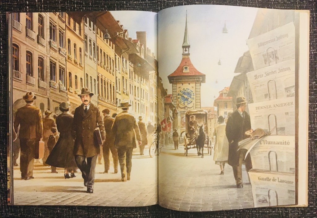 Comme dans les tomes précédents, la forme est vraiment à mi-chemin entre l’album illustré et le roman : le texte est étoffé, avec une belle intrigue piquée de clins d’œil malicieux (notamment à Stephen Hawkins et à la mythologie grecque !), mais indissociable des splendides illustrations. Tout au plaisir de suivre notre minuscule scientifique dans son investigation, on remarque à peine qu’on apprend une foule de choses sur le temps, l’heure, la Suisse, la vie d’Einstein et sa fameuse théorie. Mais surtout, foi de chercheuse : je ne connais pas de livre qui restitue mieux que ceux de Kuhlmann le plaisir de poser de bonnes questions, de formuler des hypothèses et de progresser pas à pas vers la solution. Ce cheminement scientifique est mis en scène comme une aventure, impliquant l’exploration de lieux fascinants (et incommensurables, vus à hauteur de souris !), des bonds vertigineux et la fuite devant de redoutables prédateurs… Des péripéties sublimées par le crayon de Kuhlmann qui brosse le décor avec un sens méticuleux des détails vintage et ses adorables petites héroïnes de façon très expressive.