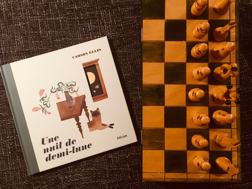Comment ne pas être intrigué.e en constatant que non seulement c’est une nuit de demi-lune, mais que nous avons aussi affaire à une demi-fenêtre, un demi-chat, une demi-table et un demi-vase de fleurs ? Ces pages élégantes ont des allures de demi-imagier, leurs rimes sonnent comme une petite comptine. L’ensemble déborde de poésie – et d’énigmes.