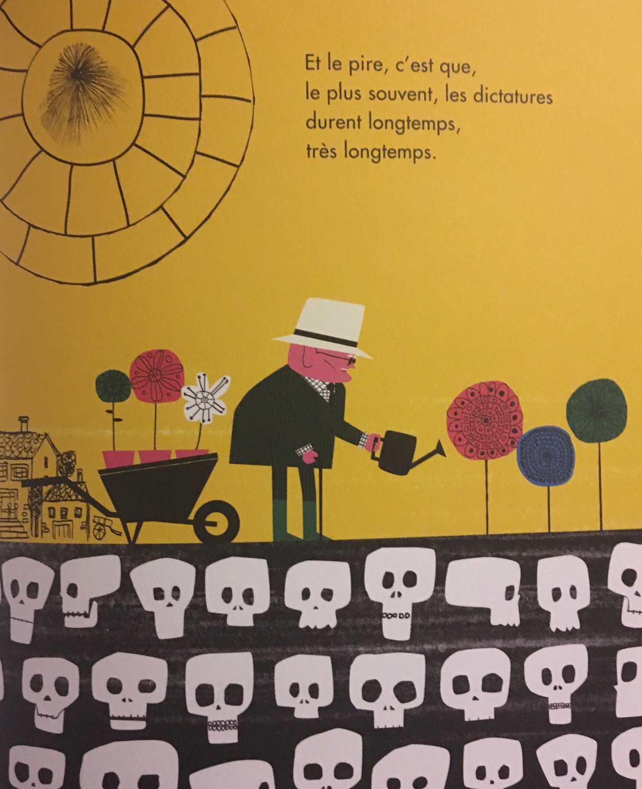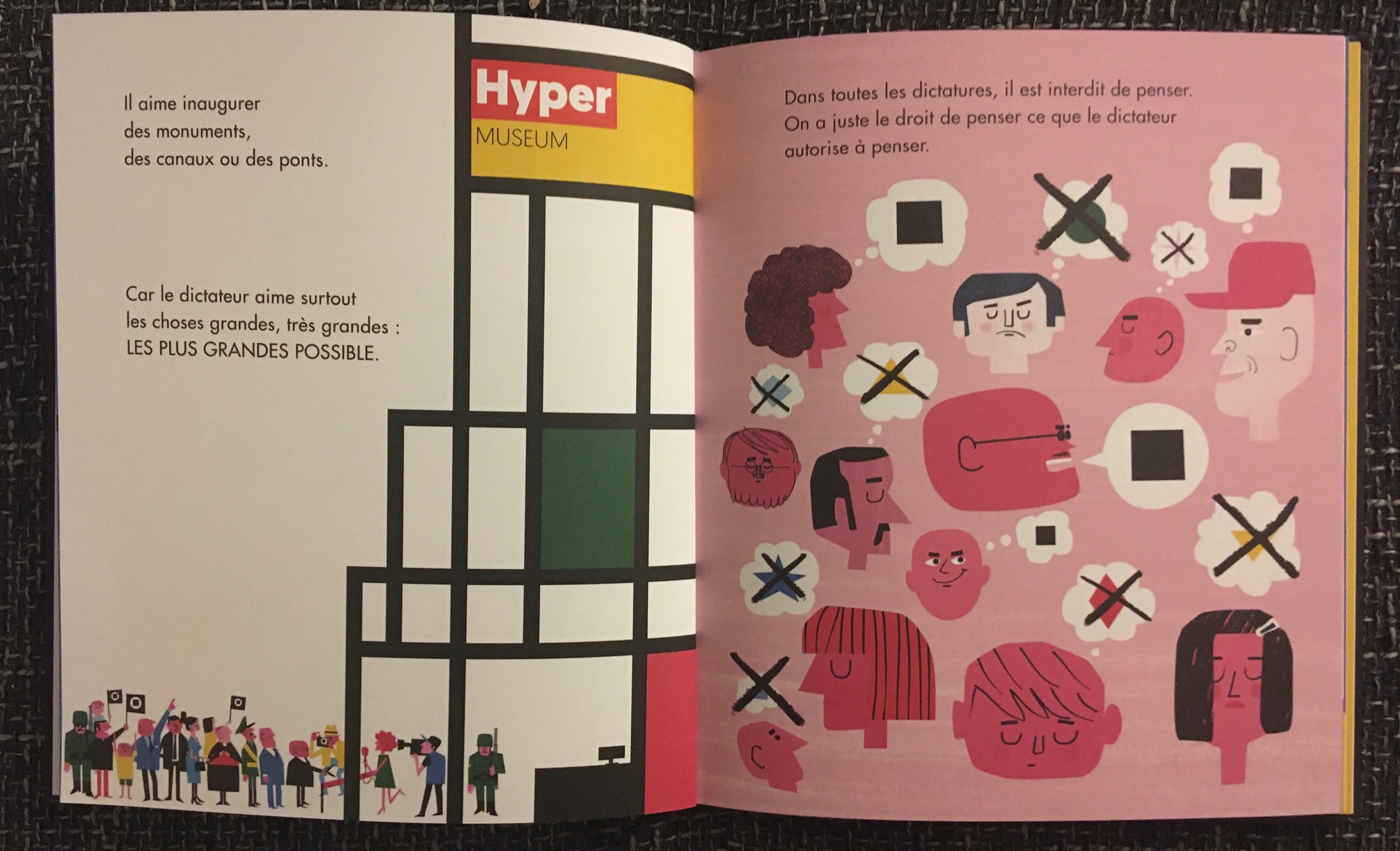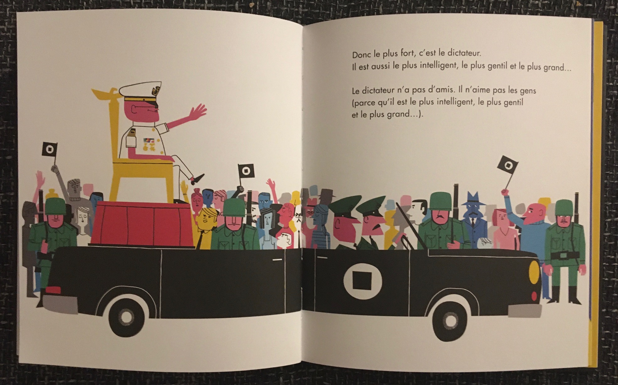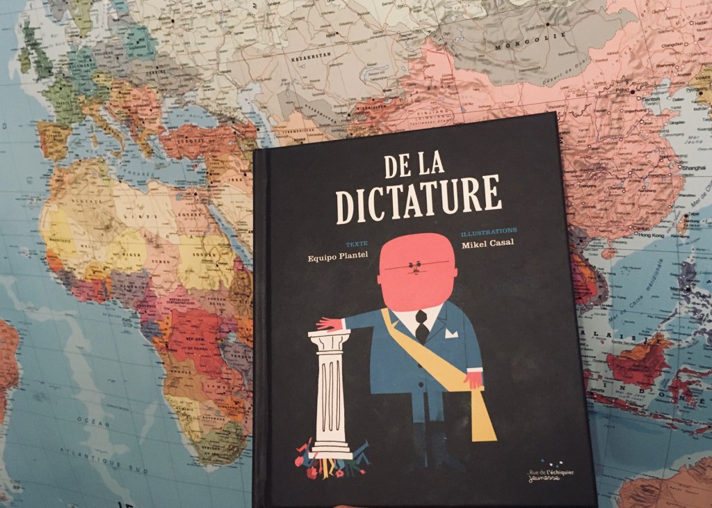 Commençons donc aujourd’hui avec De la dictature, paru initialement en Espagne, au lendemain du franquisme. Quarante ans plus tard, les dictatures restent d’une triste actualité et cette réédition en français, sous la forme d’un album coloré qui a immédiatement intrigué les enfants, est bienvenue. En quelques mots limpides, Equipo Plantel dit le pouvoir absolu et arbitraire qui s’ingère jusque dans les têtes, le règne de la terreur, du mensonge et de la corruption, la folie des grandeurs, le culte de la personnalité, l’économie de prédation, les difficultés immenses de résister. Voilà un beau travail de vulgarisation, sublimé par les illustrations satiriques de Mikel Casal qui parvient à évoquer ces sujets graves avec un humour rappelant celui de Charlie Chaplin dans Le dictateur.