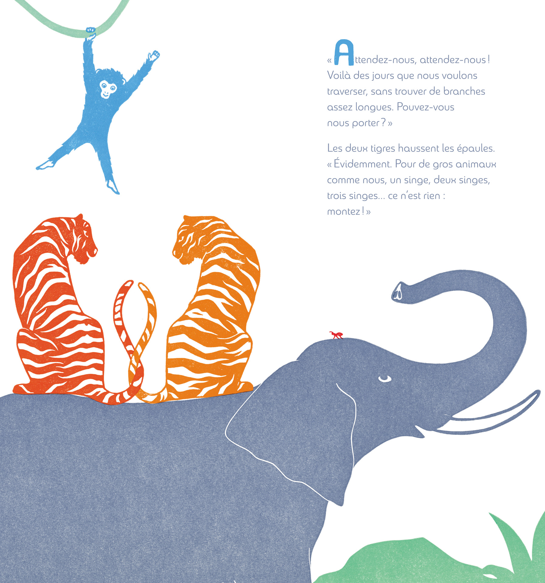 Un éléphant s’apprête à traverser le fleuve. Robuste et généreux, le pachyderme ne voit aucun inconvénient à ce qu’un duo de tigres suivi d’une ribambelle d’autres animaux exotiques profite du voyage. C’est ainsi que s’érige sur son dos une pyramide toujours plus audacieuse, sublimée par le format tout en hauteur et par la drôlerie des illustrations. Mais évidemment, arrive la bestiole de trop qui, même minuscule, va bousculer le cours de la traversée. Il se pourrait même que finalement les plus gros aient besoin de l’aide des petits…