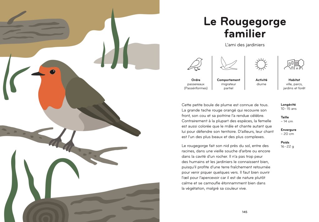 L’objet-livre, la mise en page et les illustrations stylisées sont attrayants. Et ce n’est pas un miroir aux alouettes, les contenus sont tout à fait à la hauteur ! Didactiques et plaisants, ils fournissent des repères s’y retrouver dans l’immense famille des oiseaux. On apprend à identifier les signes distinctifs de chaque ordre, à différencier les espèces en fonction de leur comportement ou de leur habitat. Et surtout, on picore mille informations réjouissantes : saviez-vous que certains oiseaux ne volent pas ? Que d’autres savent dormir d’un œil ou sont bâtis pour pouvoir frapper des troncs d’arbres de 10.000 coups de bec par jour sans attraper la migraine ?