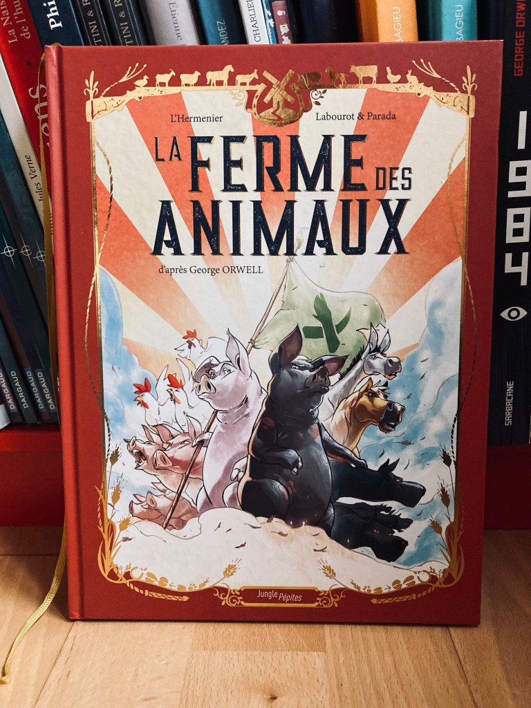 À toutes et à tous, cette adaptation BD offre une entrée attrayante dans un texte classique incontournable. L’objet-livre est soigné, avec sa couverture épaisse mise en scène comme une affiche communiste, son papier épais, ses belles couleurs et son ruban marque-page. Le scénario est fidèle au roman à quelques détails près, pour la plupart peu importants même si j’ai regretté la disparition du corbeau et de l’hymne Bêtes d’Angleterre qui m’avaient bien fait rire. Pour le reste, presque tout y est et les graphismes portent le récit dans un univers à la frontière entre dessin animé et caricature que j’ai trouvé très seyant. L’ensemble parvient à merveille à mettre le texte d’Orwell à hauteur d’enfant (mais pas que !), conjuguant efficacement mouvement et réflexion, humour et subversion.