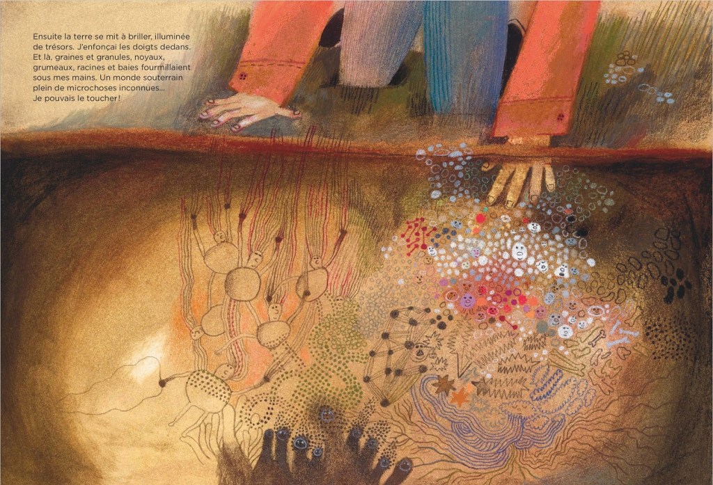 Les illustrations de Béatrice Alemagna sont fabuleuses (« les plus belles que j’ai jamais vues », dixit mon moussaillon de dix ans). Elles ont un charme singulier et mélancolique qui respire merveilleusement l’intensité de l’enfance. Elles nous font ressentir le désarroi de ce petit chaperon orange fluo, puis la manière dont il s’affirme au contact de la nature. De quoi nous donner envie de lever les yeux de nos écrans et de prendre un grand bol d’air. D’empoigner de la terre humide à pleines mains. D’explorer les environs, au gré des rencontres et de son imagination, à la recherche de petits trésors.