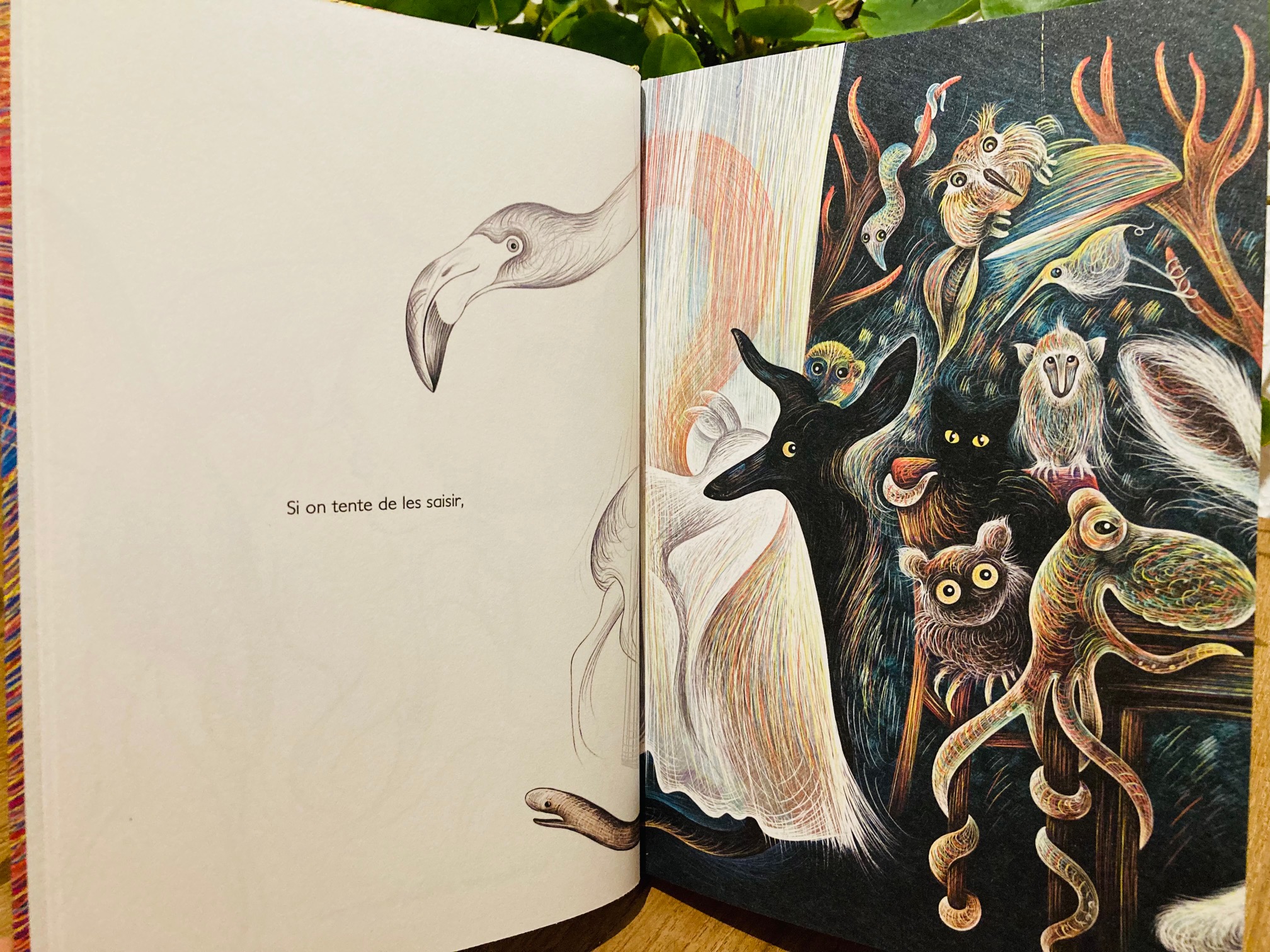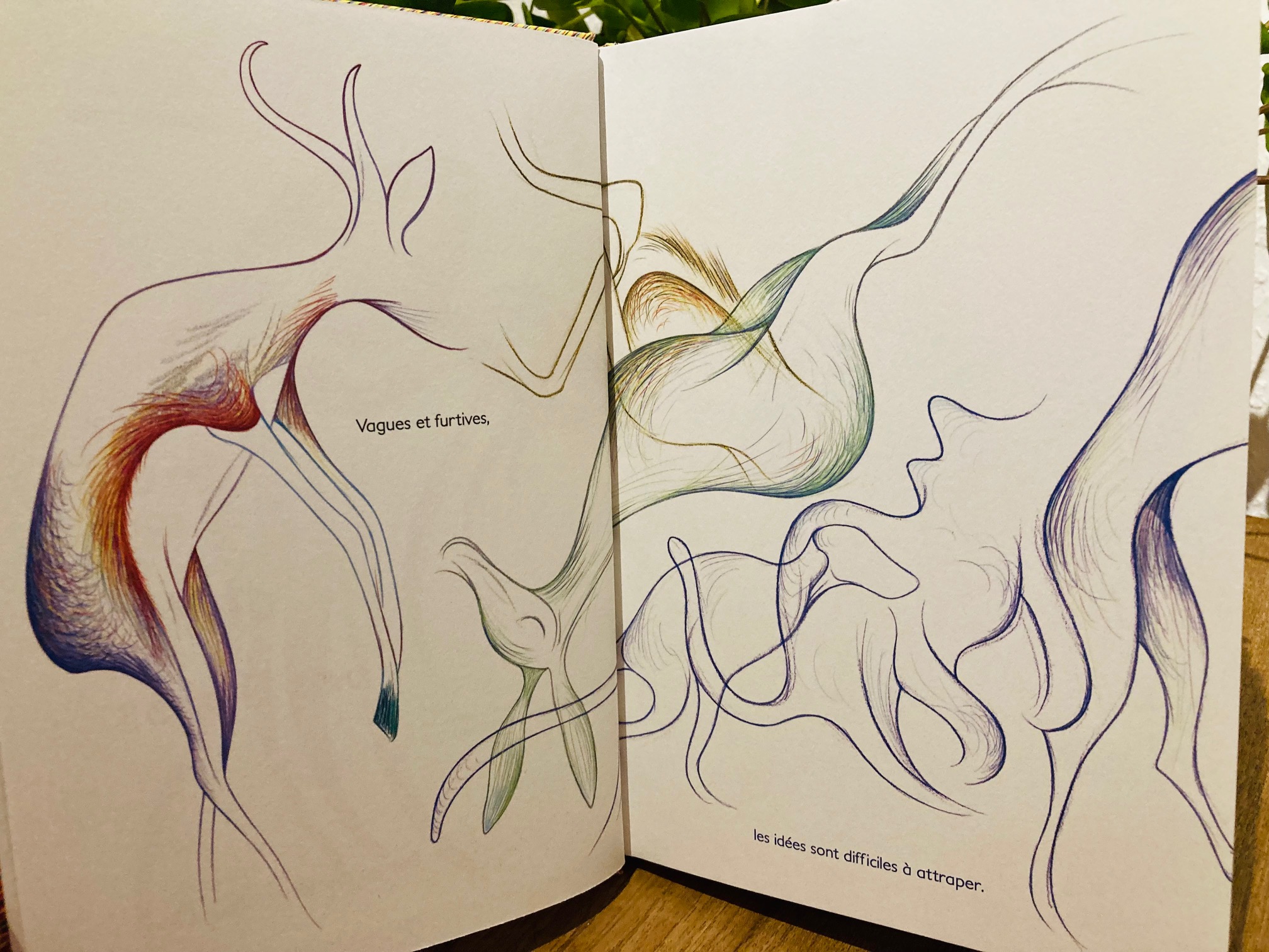Autant de questionnements fascinants, mais qui pourraient sembler abstraits pour un album jeunesse. Mais voilà : les enfants adorent poser ce genre de questions et cet album fait magistralement la preuve qu’en symbiose, mots et images permettent de restituer ce qui aurait pu sembler insaisissable. Cela semble presque magique. Isabelle Simler utilise une langue imagée aux effets hypnotiques tout en donnant une forme fabuleuse aux choses les plus abstraites : le vertige d’une création dont les contours sont encore ouverts, la furtivité des idées à la marge de la conscience, leur résistance aux tentatives de les fixer, la façon dont elles s’apprivoisent par le lâcher-prise, l’ouverture d’esprit, la patience et la persévérance.