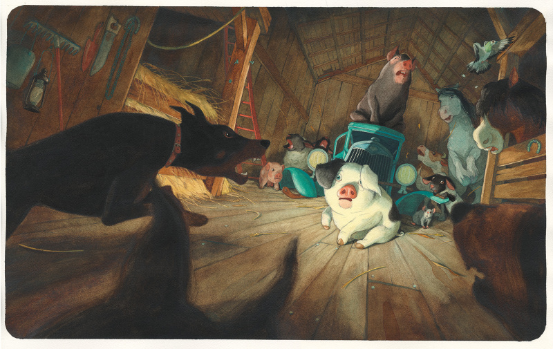 Les aquarelles naviguent entre un univers idyllique et vintage servi par une palette de couleurs généreuse et le registre de la caricature déjà présent dans le texte d’Orwell. J’étais d’ailleurs extrêmement curieuse de voir comment l’illustrateur se dépêtrerait de l’incroyable dénouement de l’histoire ; et bien, son final est magistral et ébouriffant.