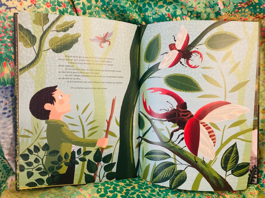 Sur le mode de la promenade en compagnie d’un enfant émerveillé, cet album rend hommage aux forêts majestueuses mais fragiles qui ravissent tous nos sens. Sublimées par le grand format, les illustrations sont de toute beauté. Elles laissent une impression durable sur la rétine, un sentiment de plénitude procuré par les couleurs chatoyantes et dorées, les formes stylisées, l’émerveillement suscité par des spécimens végétaux et animaux représentés dans leurs moindres détails.