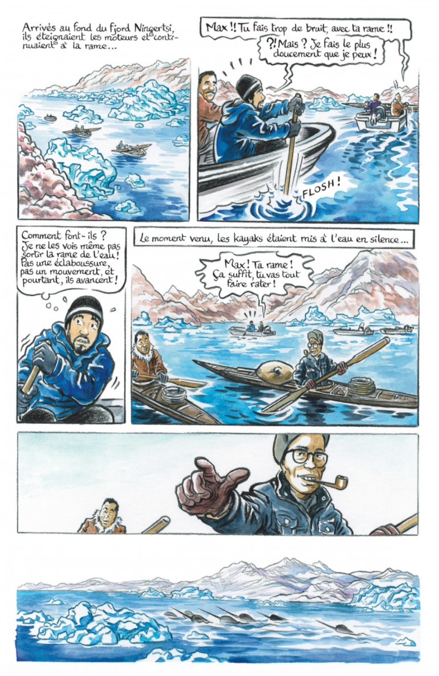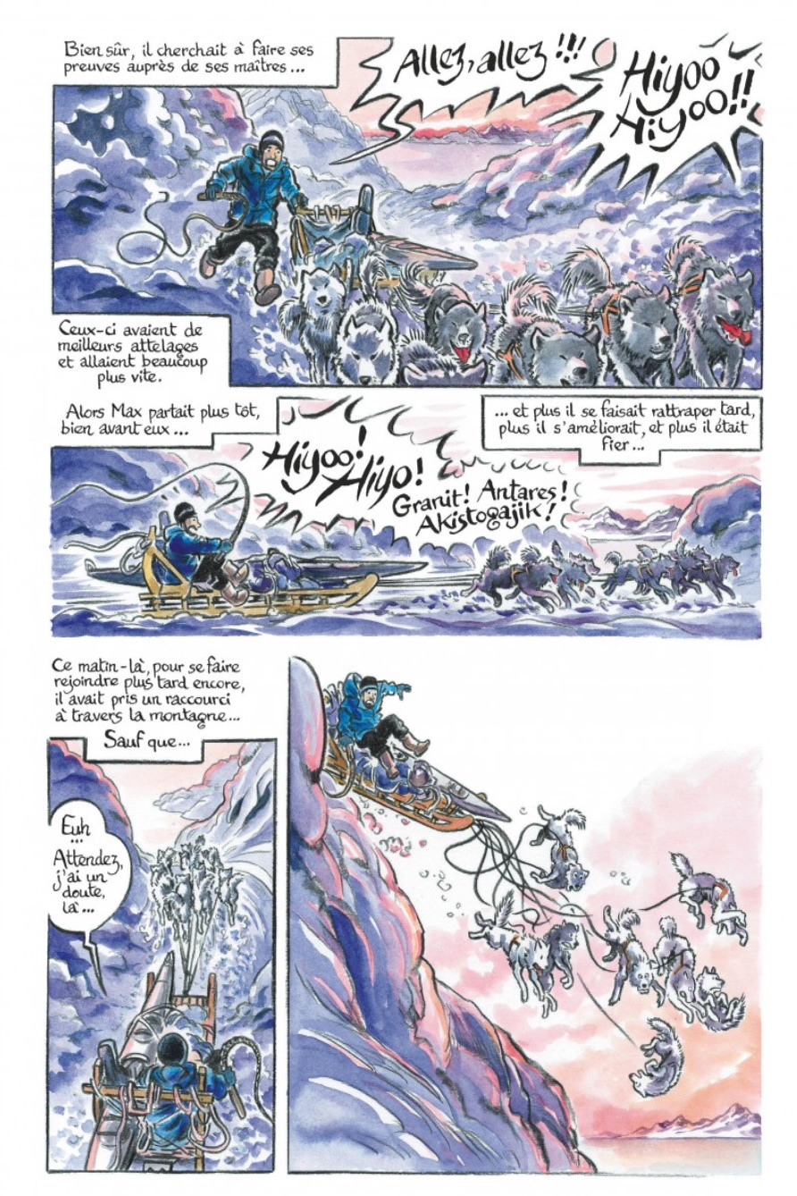 Les premières pages sont d’emblée époustouflantes par la pureté grandiose du décor, immense fjord gelé parsemé d’innombrables blocs de glace. La nature règne en maître et, Max l’apprendra vite, ses lois sont implacables. La moindre erreur peut être fatale. Et mille millions de morses, ce n’est vraiment pas de la tarte de gérer une meute de chiens, d’affronter le blizzard ou de déployer un filet de pêche sous la glace. Cela provoque des mésaventures tour à tour drôles et terrifiantes.