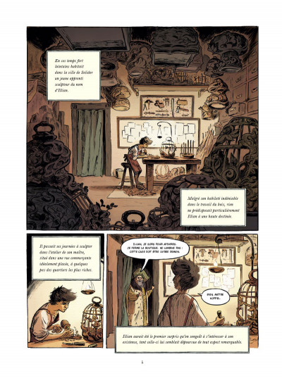 Le duo d’auteurs alterne des séquences BD classiques et des doubles-pages pleines de détails qui contribuent à installer l’atmosphère particulière du conte. Le registre semi-réaliste des illustrations n’est pas celui que je préfère mais j’ai aimé ressentir le plaisir qu’a pris Gaëlle Hersent à représenter les recoins de la cité, les objets sculptés de l’atelier ou les parures des notables. Le Boiseleur se rapproche parfois aussi de la narration de l’album, avec des récitatifs particulièrement littéraires qui décrivent la presque-île de Solidor, le paysage musical composé par le chant des oiseaux de la ville ou les pensées d’Illian.