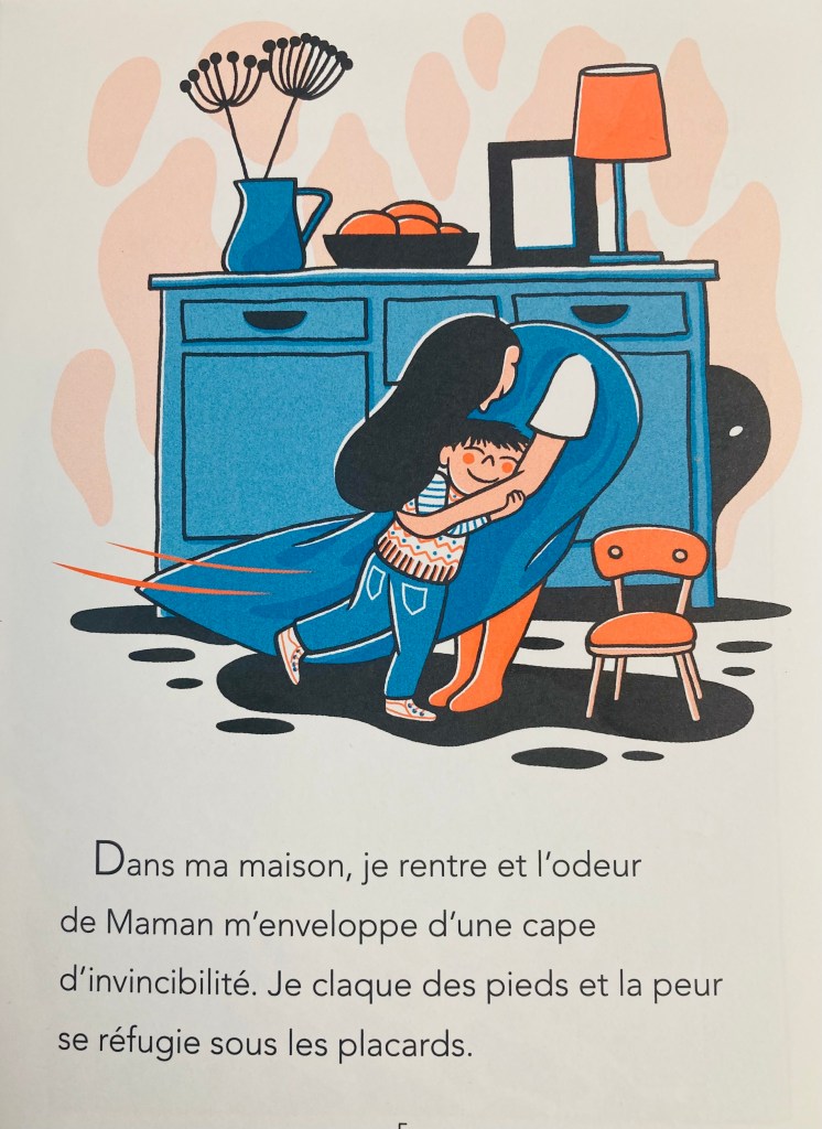 J’ai aimé l’idée de représenter la peur par une forme noire indistincte qui se tapit dans les coulisses du quotidien. Cette poésie permet d’évoquer le sujet avec justesse, dans le cadre d’un texte court. Anne-Lise Boutin (Les frères Zzli) donne joliment forme à la métaphore dans des illustrations en bichromie bleu/orange au charme vintage.