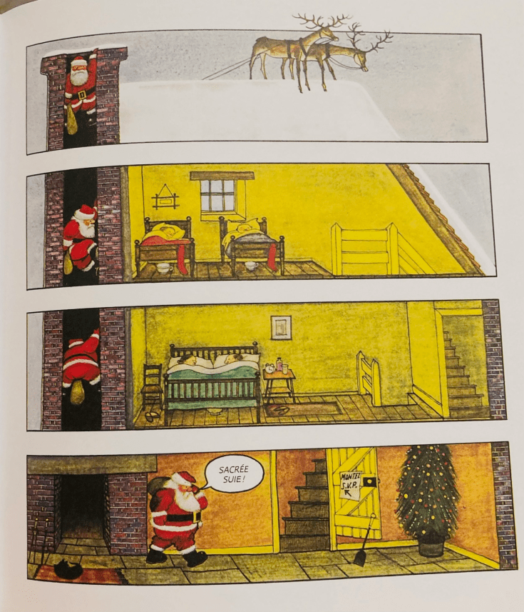 La première histoire nous révèle l’envers du décor féérique de Noël. Sacré boulot que de devoir se lever aux aurores et braver le froid et la cendre des cheminées dans son costume rouge pour distribuer des cadeaux sur toute la planète ! Sacrée neige ! Sacrés pieds gelés ! Sacrés logements inaccessibles ! Le père Noël grogne et bougonne, rouspète et ronchonne… au point que cela devient franchement entraînant et qu’on prend grand plaisir à râler de concert. Il y a aussi quelque chose de satisfaisant à le voir accomplir si bien sa tâche pour le bonheur des habitant.e.s du monde entier. Puis goûter un repos bien mérité avec un festin, de l’alcool bien fort et une bouillotte.