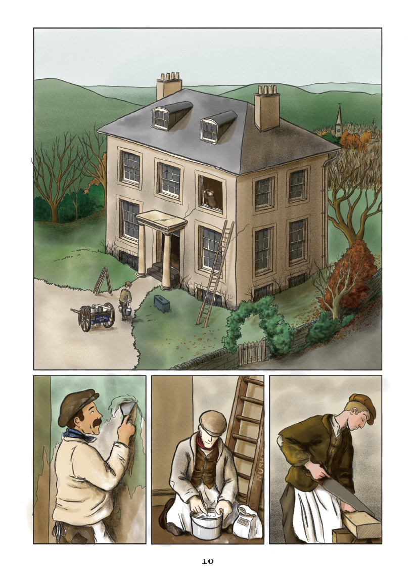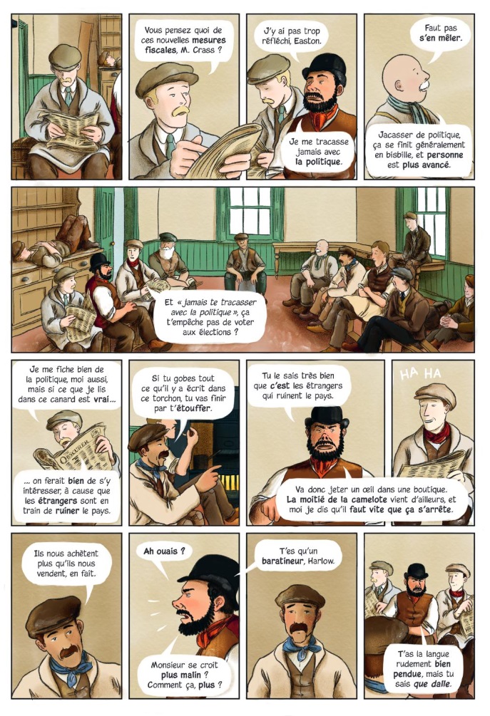 Alors certes, on ressent le didactisme du texte original. Tout tourne autour de la critique sociale du capitalisme, les personnages semblent à chaque instant ployer sous la violence des rapports de classe et leurs conversations voient constamment le socialiste Owen tenter de convaincre ses collègues de ses idées. Sur des pages et des pages, les arguments fusent, s’opposent, se répondent. On réfléchit aux causes de la pauvreté, aux maux qui minent la société, aux solutions… Ces cases bavardes sont un peu laborieuses à la longue. Mais en même temps, elles offrent une introduction accessible et attrayante dans l’ensemble à des théories qui n’ont malheureusement jamais été aussi actuelles : un vrai petit manuel illustré ! Qui développe ses thèses dans la bouche d’Owen, mais les incarne aussi par le biais des multiples personnages qui n’omettent pas la perspective des femmes et des enfants.