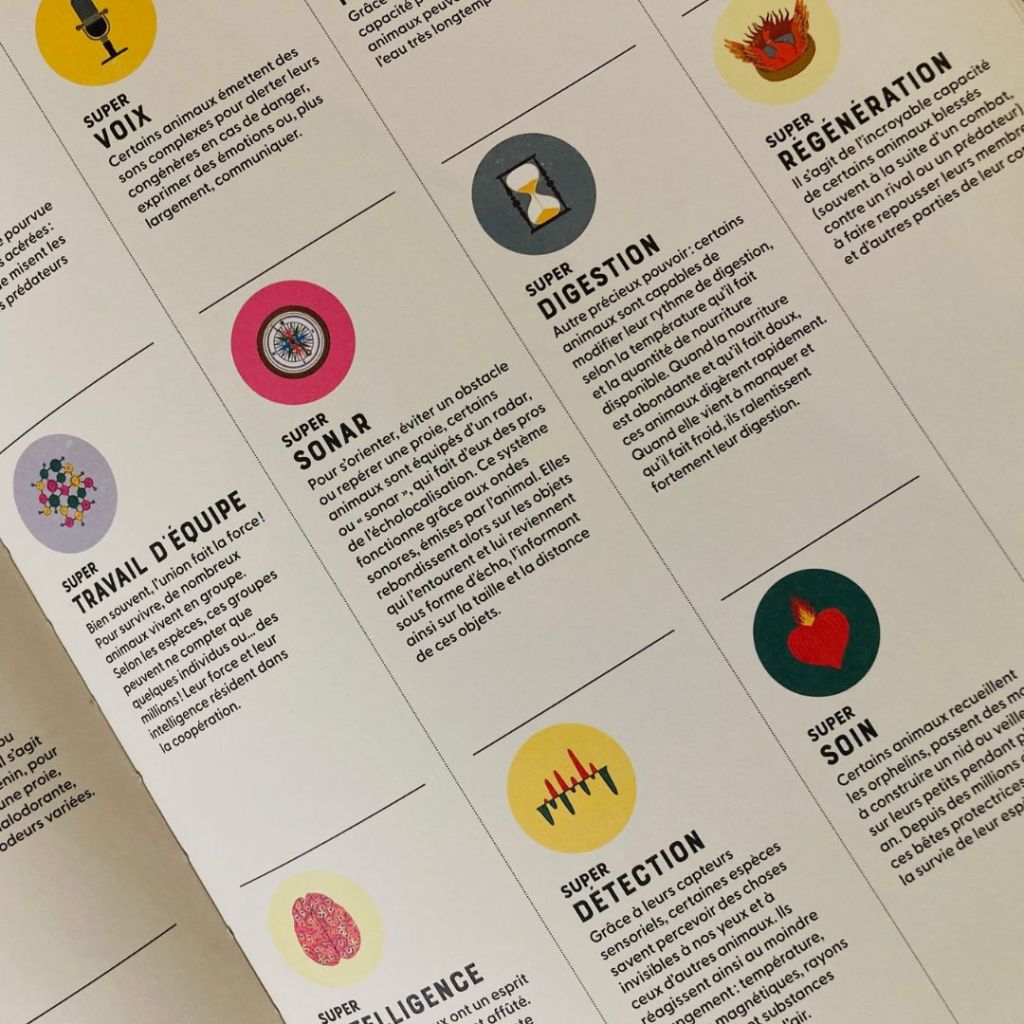 Nous avons choisi d’explorer ce documentaire sous forme de devinette : qui cumule les pouvoirs de travail d’équipe permettant de collaborer à plusieurs millions d’individus, de super-force permettant de soulever 50 fois son poids avec sa mâchoire, de super-chimie permettant de faire exploser son abdomen pour projeter un liquide toxique sur l’ennemi combiné à un odorat permettant du même coup de donner l’alerte ? C’est évidemment la fourmi explosive de Malaisie ! Mon moussaillon de douze ans s’est révélé assez incollable ; d’autres prendront tout autant de plaisir à simplement lire à voix haute ces pages attrayante et sublimement illustrées.