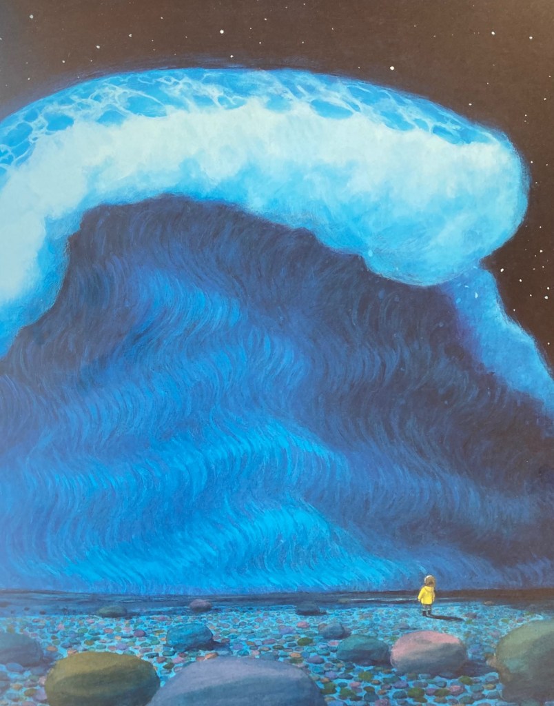J’ai toujours adoré contempler l’océan, me laisser hypnotiser par le soulèvement de l’eau, le gonflement d’une vague qui se déroule tranquillement à marée basse ou se brise prématurément sur le sable à marée haute. Chaque vague semble avoir sa personnalité. Il y a les rouleaux déferlants, les grandes lames majestueuses, les vaguelettes taquines qui viennent vous chatouiller les orteils. Évidemment il y a là une matière fabuleuse pour imaginer des histoires. Jean-François Chabas et Christel Espié ne s’y sont pas trompés.