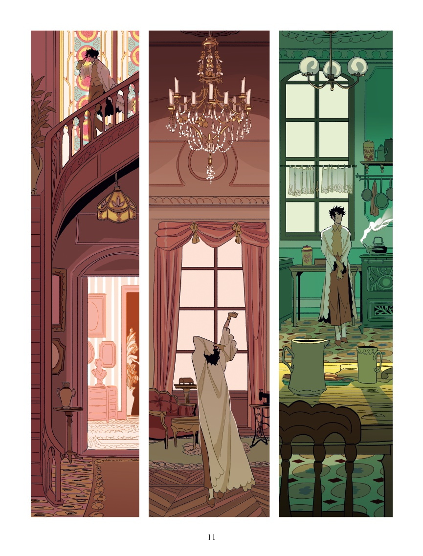 Tout, dans ce volume, respire le vieux manoir anglais : tranche aux allures de tapisserie florale, dorures du titre, décoration chargée aux accents victoriens, portraits aux murs qui semblent nous suivre du regard… Et cette odeur de poussière – bon, pas vraiment, mais on jurerait presque la sentir en tournant les pages. On devine tout le plaisir qu’éprouve Gaëlle Geniller à dessiner les splendides finitions des meubles, ornements et vêtements. Et à provoquer le doute : le tic-tac d’une horloge, des ombres fuyantes, des grincements : tout cela compose une atmosphère néogothique où l’on frissonne de voir un père et son fils, seuls, reclus. Que font-ils, ainsi isolés ? Pourquoi ne dorment-ils pas la nuit ? Sont-ils en danger ?